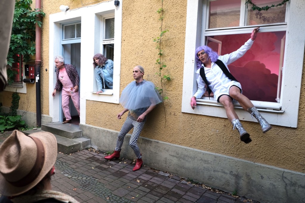 Die Vorstellung findet zum Teil unter freiem Himmel statt, zum Teil in geschlossenen Räumen. Alle Räume sind ausreichend belüftet. Die Abstandsregeln werden zu jedem Zeitpunkt eingehalten. Als Zuschauer*in sind Sie maximal mit einer weiteren Person im Raum. Bitte führen Sie einen Mund-Nasen-Schutz mit sich. Sie müssen während der Vorstellung kurze Wege zu Fuß zurücklegen, zum Teil gibt es Stufen.