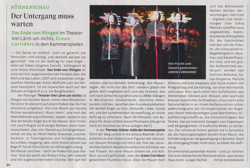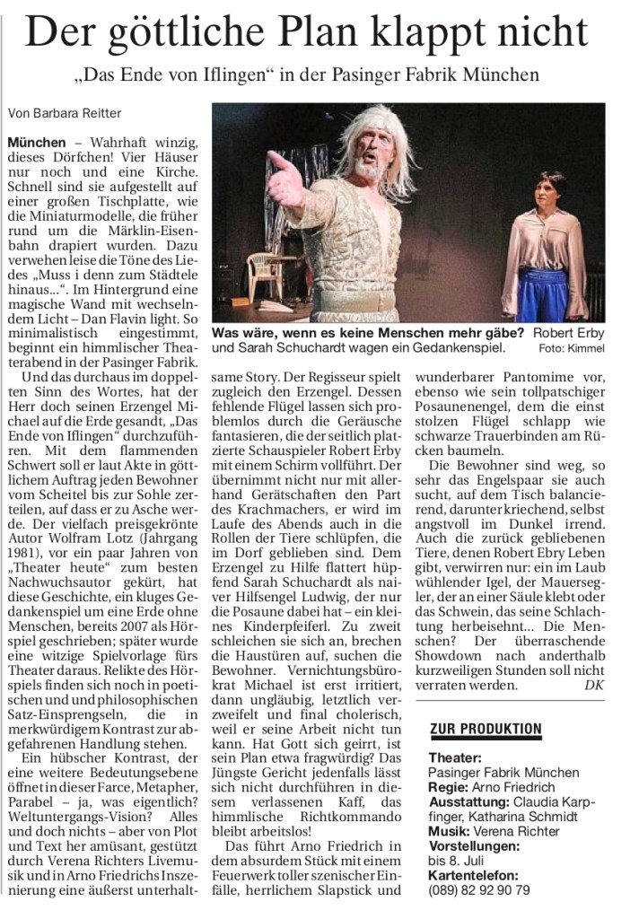 „Eine herrliche Parabel über die Welt und das Leben. (…) Die Häuser sind leer – doch sie finden ein paar Viecher. Und die spielt alle Robert Erby, sehr speziell und mit augenzwinkerndem Charme (…) Herrliche Höhepunkte sind das, zwischen den Grundsatzdebatten der beiden Engel zu Sinn, Vernunft, Liebe, Sünde, etc. (…) nach 90 Minuten viel Applaus für diese schöne, kleine Phantasie.“